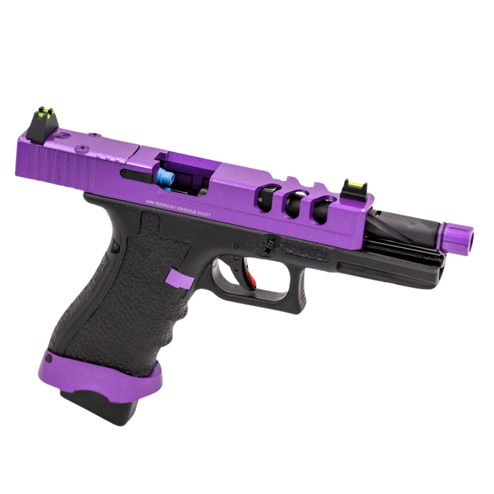 Pistola softair Vorsk EU8-V in polimero HIPS rinforzato e carrello in alluminio lavorato CNC per una combinazione perfetta tra peso ridotto e resistenza. Le mire in fibra ottica sono adatte per aiutarti nelle sessioni di gioco a scarsa luminosità, mentre il magwell svasato facilita l'inserimento del caricatore velocizzando le ricariche.